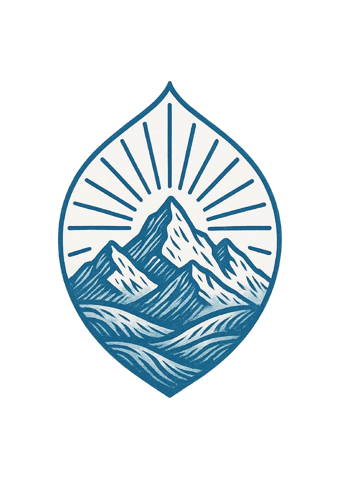 Diese Tattoovorlage zeigt eine stilisierte Berglandschaft mit klaren Linien und strahlenden Sonnenstrahlen. Die Komposition vermittelt ein Gefühl von Freiheit und Abenteuer, ideal für Naturliebhaber.
