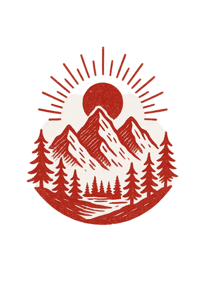 Diese Tattoovorlage zeigt eine stilisierte Berglandschaft, die von Bäumen umgeben ist und einen eindrucksvollen Sonnenuntergang präsentiert. Die Verwendung von kräftigen Rot- und Weißtönen verleiht dem Design eine markante und auffällige Erscheinung, ideal für Tattoos auf dem Oberarm.