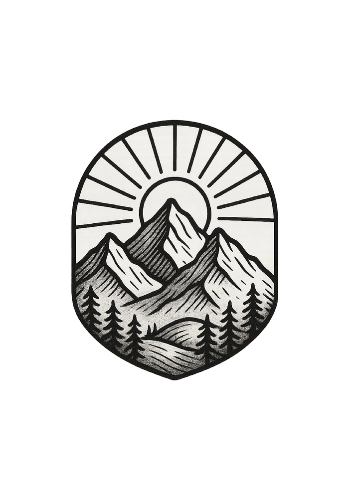 Die Tattoovorlage zeigt eine stilisierten Berglandschaft mit hohen Bergen, die von Wald umgeben sind. Im Hintergrund strahlt eine sonnige Atmosphäre, die dem Motiv eine harmonische Note verleiht. Diese Vorlage ist ideal für Tattoo-Liebhaber, die die Schönheit der Natur schätzen.