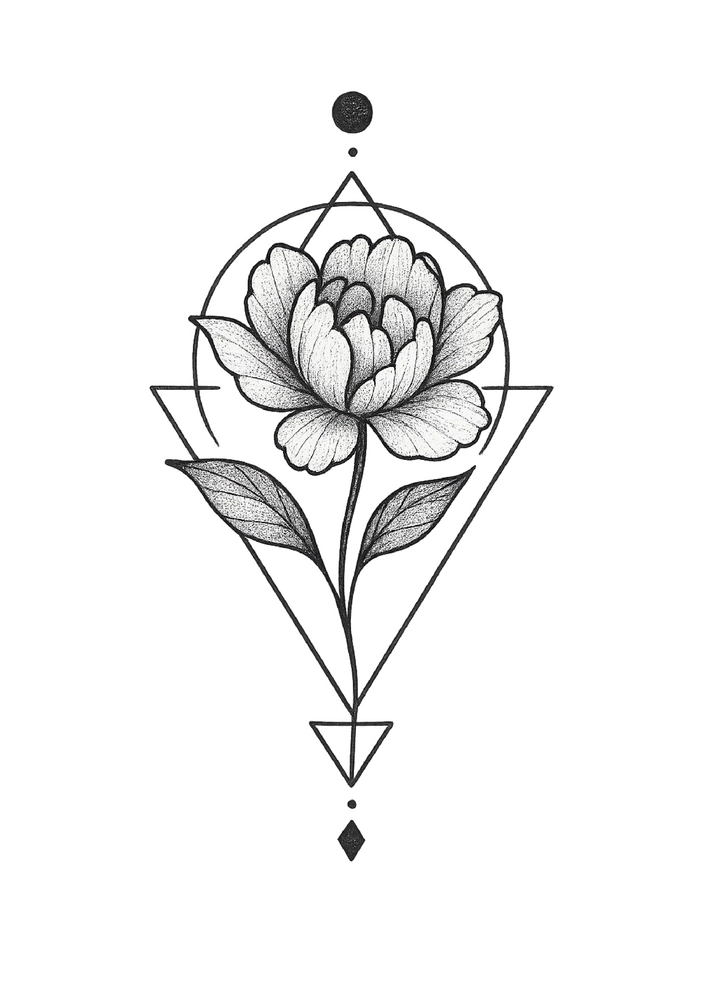 Diese Tattoovorlage zeigt eine stilisierten Blume, umgeben von geometrischen Formen. Die schwarz-weiße Darstellung vermittelt eine harmonische Ästhetik, ideal für Tattoo-Liebhaber, die natürliche Motive bevorzugen.