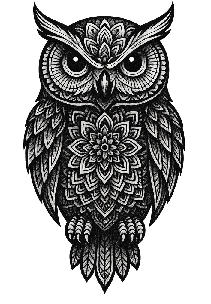 Diese Tattoovorlage zeigt eine beeindruckende Eule, die kunstvoll in einem Mandala-Stil gestaltet ist. Die detaillierten musterhaften Elemente und die markanten Augen der Eule verleihen dem Design eine mystische Ausstrahlung.