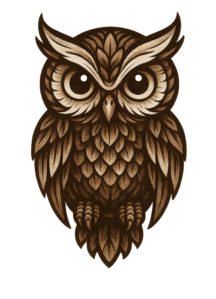 Stilisierte Eule mit ausdrucksvollen Augen für ein einzigartiges Tattoo.