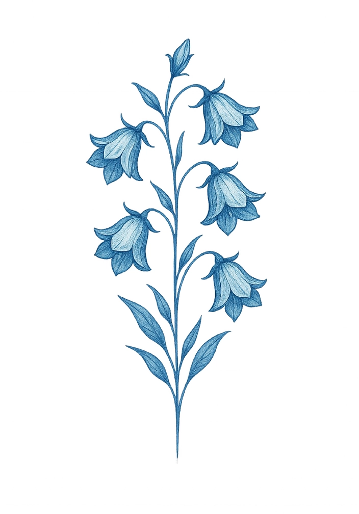 Die Vorlage zeigt stilisierte Glockenblumen in Blau, ideal für eine feminine Tätowierung.