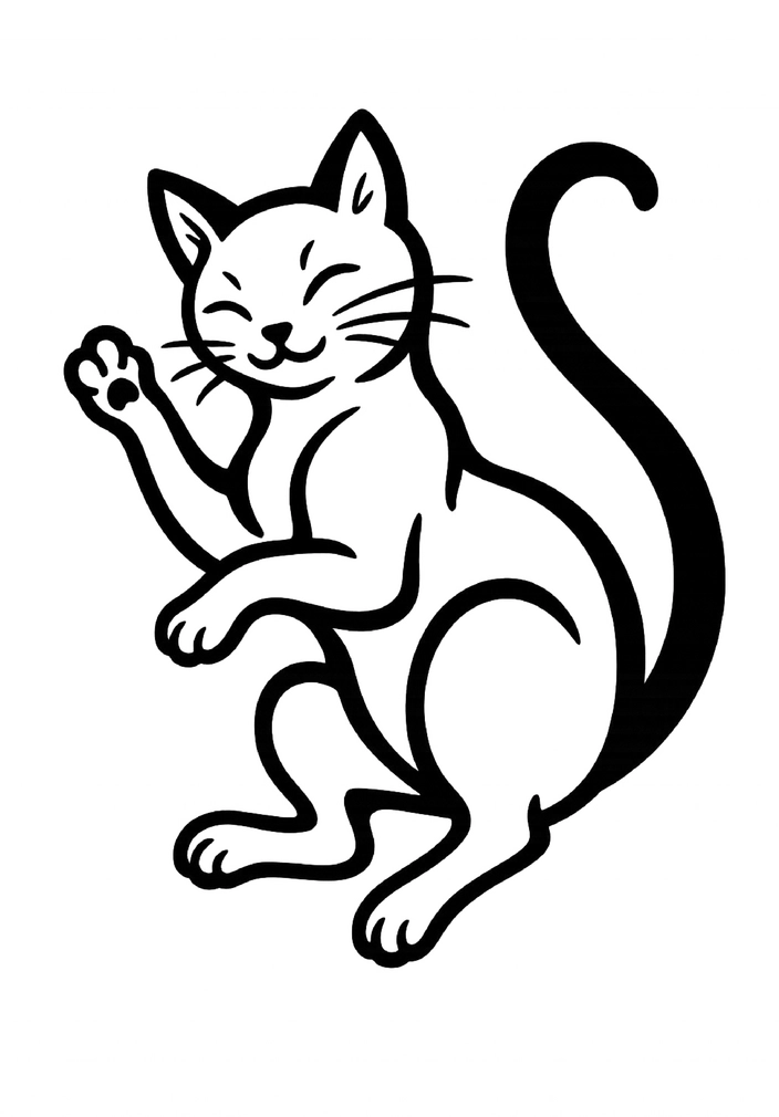 Die Tattoovorlage zeigt eine stilisierte Katze in einer verspielten Pose. Die Katze wirkt freundlich und einladend, mit einem fröhlichen Gesichtsausdruck und einer aufgerichteten Pfote, die zum Winken anregt. Dieses Motiv eignet sich hervorragend für Katzenliebhaber, die ein symbolisches Tattoo in Betracht ziehen.