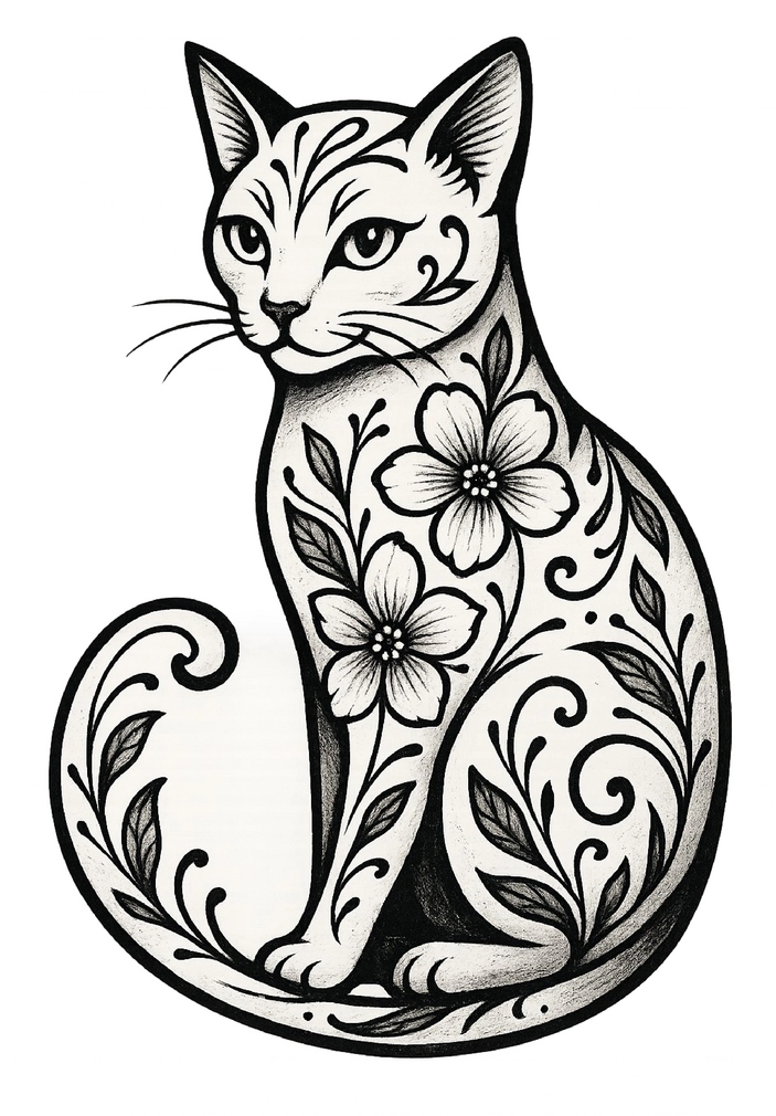 Eine stilisierte Katze mit floralen Mustern als Tattoo-Vorlage.