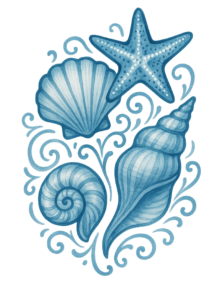 Diese Tattoovorlage zeigt eine stilisierte Darstellung von Meeresbewohnern, darunter eine Muschel, ein Seestern und verschiedene Schnecken. Die sanften, blauen Farbtöne und filigranen Verzierungen verleihen dem Design eine verspielte und maritime Note.