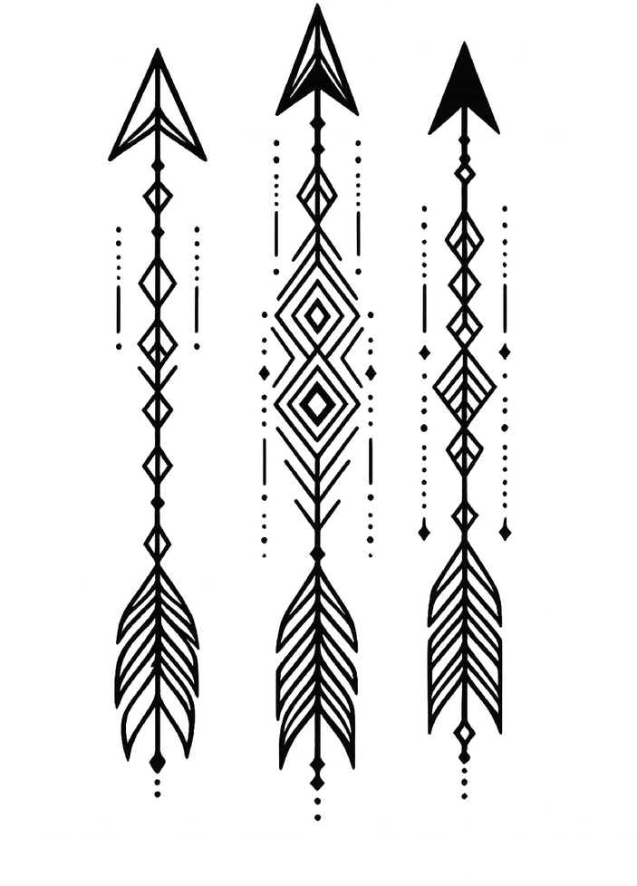 Die Tattoovorlage zeigt drei stilisierte Pfeile, die mit geometrischen Mustern und Linien verziert sind. Die Pfeile stehen symbolisch für Richtung und Entwicklung, was sie zu einer beliebten Wahl für Tattoo-Enthusiasten macht. Jedes Design kombiniert klare Linien und detaillierte Elemente, die sowohl modern als auch zeitlos wirken.