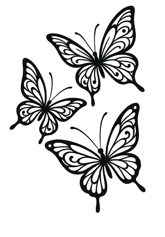 Diese Tattoovorlage zeigt drei stilisierte Schmetterlinge mit filigranen Flügeln, die harmonisch angeordnet sind. Die klare, schwarze Silhouette verleiht dem Tattoo einen eleganten Look und eignet sich perfekt für Frauen, die ein natürliches und zugleich künstlerisches Motiv suchen.