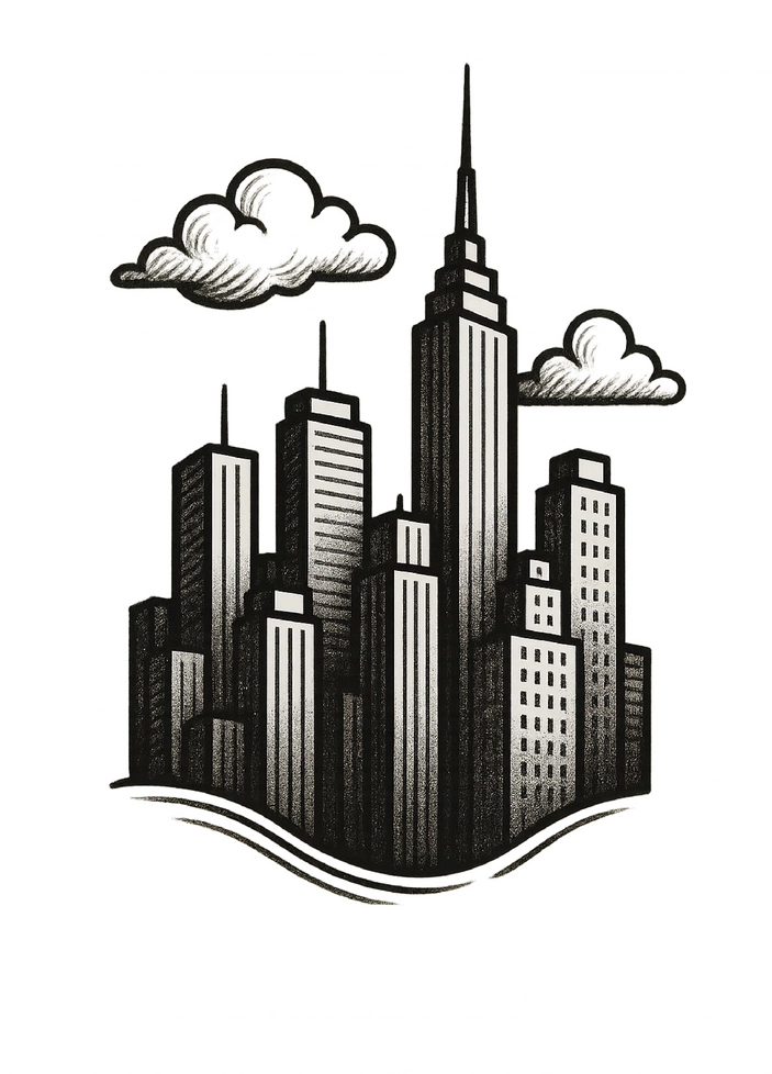 Diese Tattoovorlage zeigt eine stilisierte Skyline mit mehreren Wolkenkratzern, die in einem schwarz-weißen Design gehalten ist. Die gebäudeartigen Formen erwecken den Eindruck einer urbanen Landschaft, während die Wolken dem Bild eine zusätzliche Dimension verleihen.