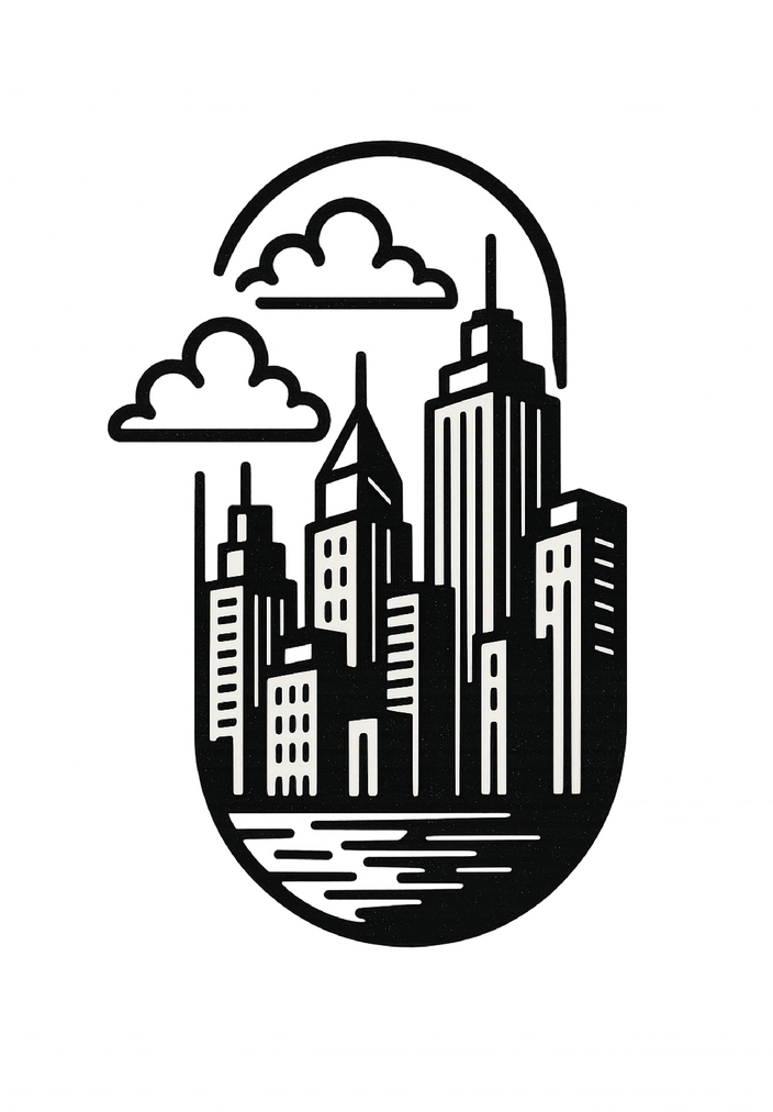 Diese Tattoovorlage zeigt eine stilisierte Stadtansicht mit beeindruckenden Wolkenkratzern und einem klaren Himmel. Die schwarz-weiße Darstellung verleiht der Vorlage eine moderne Ästhetik, die perfekt auf den Oberarm passt und städtisches Flair symbolisiert.