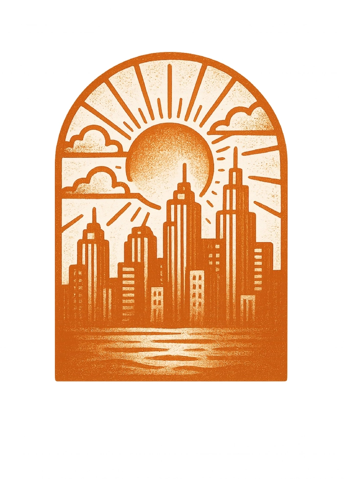 Die Vorlage zeigt eine stilisierte Stadtlandschaft mit Wolkenkratzern und einem Sonnenuntergang.