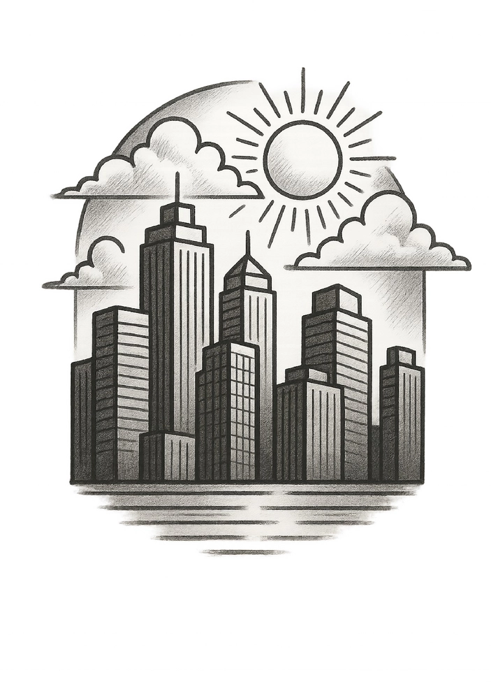 Diese Tattoovorlage zeigt eine stilisierte Stadtlandschaft mit markanten Wolkenkratzern, die vor einem sonnigen Himmel dargestellt sind. Die schwarz-weiße Ausführung verleiht dem Tattoo eine moderne und zeitlose Ästhetik.