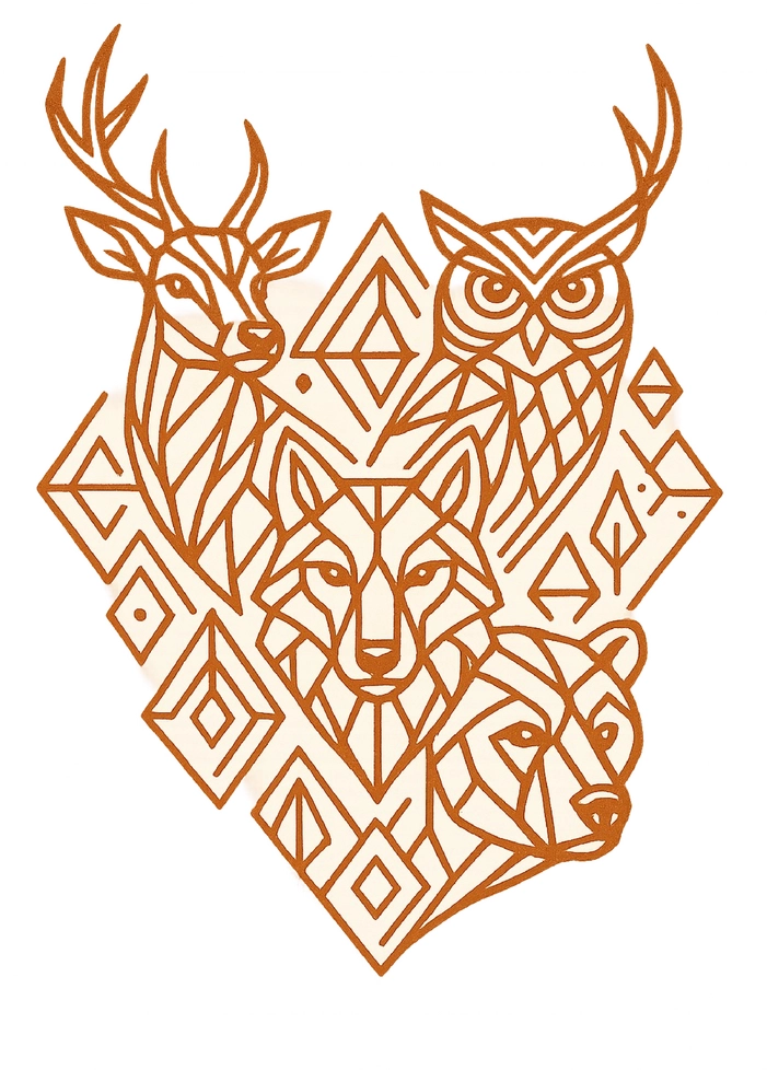 Diese Tattoovorlage zeigt eine beeindruckende Komposition stilisierter Tiere, darunter ein Reh, Uhu, Wolf und Bär. Die Tiere sind in geometrischen Formen angeordnet, was der Vorlage einen modernen und einzigartigen Look verleiht. Ideal für Liebhaber von natürlichen Motiven und Tier-Tattoos.
