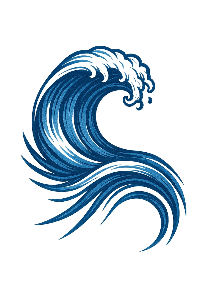Diese Tattoovorlage zeigt eine dynamische Welle, die in verschiedenen Blautönen gestaltet ist. Die geschwungenen Linien und die Detailfülle verleihen der Vorlage eine lebendige Ausstrahlung, ideal für Wasserliebhaber und Surfer. Das Motiv passt perfekt auf den Oberschenkel und strahlt eine entspannte Lebensart aus.