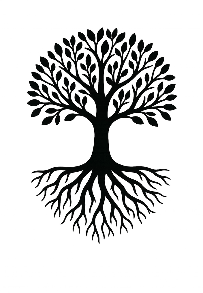 Stilisierte Baum-Tattoovorlage mit tiefen Wurzeln für einen symbolischen Körperschmuck.