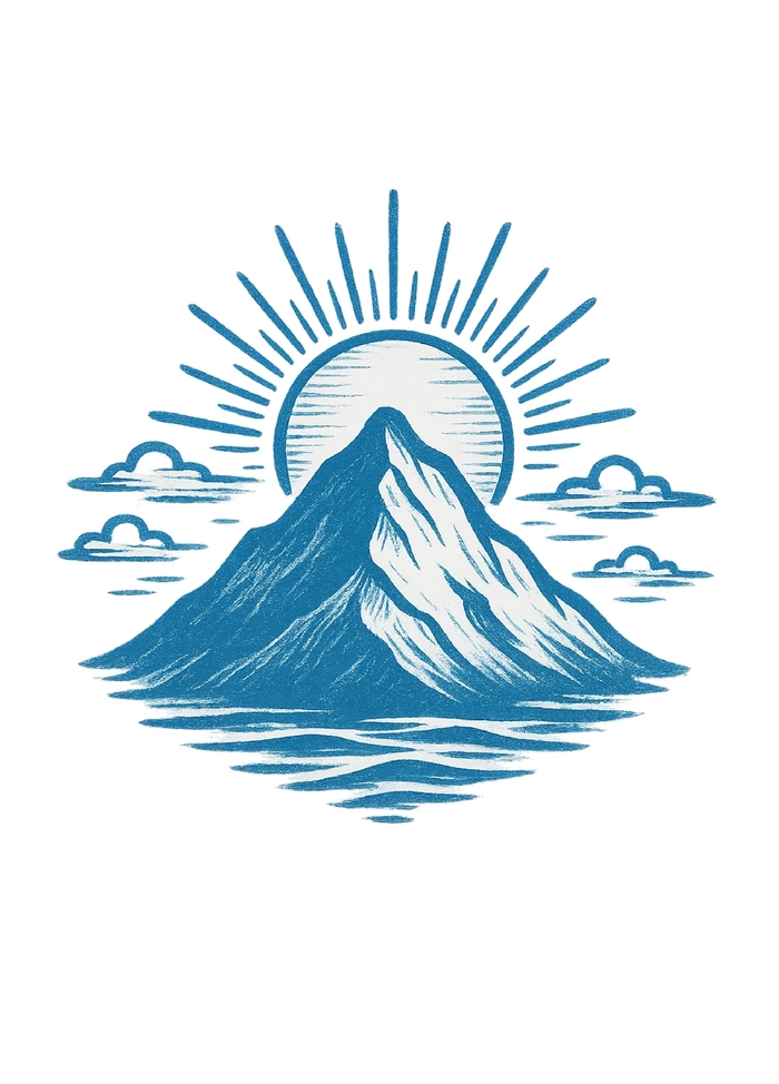 Diese Tattoovorlage zeigt einen stilisierten Berg mit Sonne und Wolken.