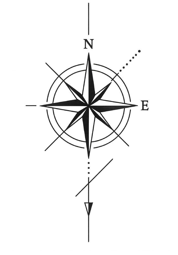 Diese Tattoovorlage zeigt einen stilisierten Kompass mit klaren Linien und einem ausgeprägten Design. Die symmetrische Form und die markanten Richtungsanzeiger machen dieses Tattoo zu einem einzigartigen Ausdruck von Orientierung und Abenteuerlust.