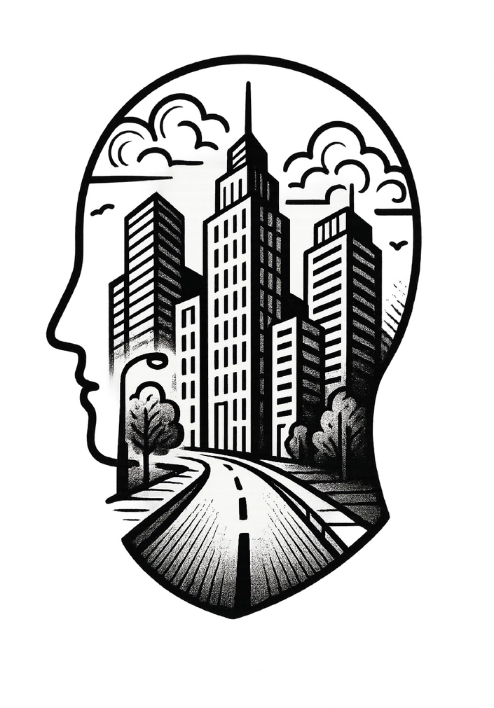 Die Tattoovorlage zeigt ein stilisiertes Gesicht, das mit urbanen Elementen, insbesondere Wolkenkratzern und einer Straße, gefüllt ist. Diese Kombination vermittelt ein Gefühl von Stadtleben und Moderne, während die schwarz-weiße Gestaltung für einen klaren, zeitlosen Look sorgt.