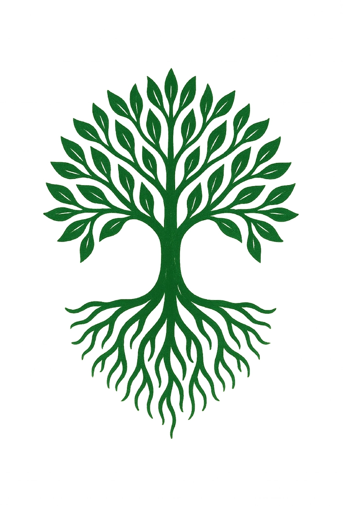 Die Tattoovorlage zeigt einen symmetrischen Baum mit ausladenden Ästen und tiefen Wurzeln. Die grüne Farbgebung vermittelt ein Gefühl von Lebendigkeit und Naturverbundenheit, was das Motiv besonders ansprechend für Tattoo-Liebhaber macht, die Wert auf organische Designs legen.