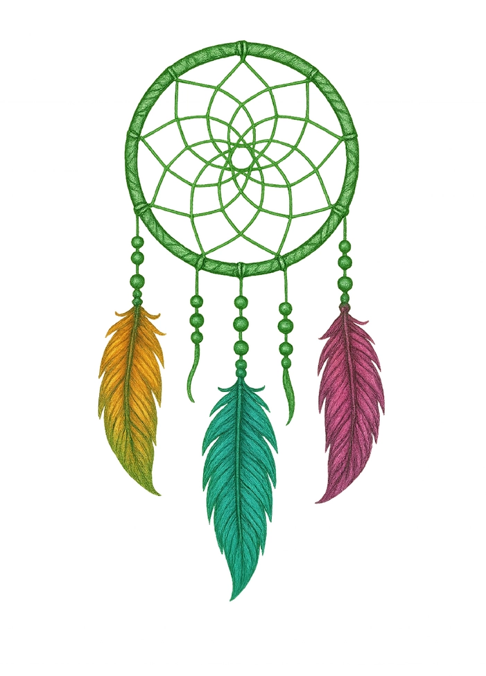 Die Tattoovorlage zeigt einen farbenfrohen Traumfänger mit grünen, orangefarbenen und pinken Federn. Die filigrane Struktur des Traumfängers ist kunstvoll gestaltet und wird von Perlen ergänzt, was ihm eine besondere Ästhetik verleiht.
