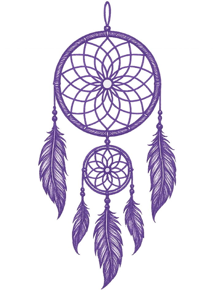 Die Tattoovorlage zeigt einen stilisierten Traumfänger mit zwei Ringen und Federn. Die lila Farbe verleiht dem Design eine besondere Note und symbolisiert Spiritualität und Schutz. Traumfänger sind bekannt dafür, böse Träume abzuwehren und positive Energien zu fördern.