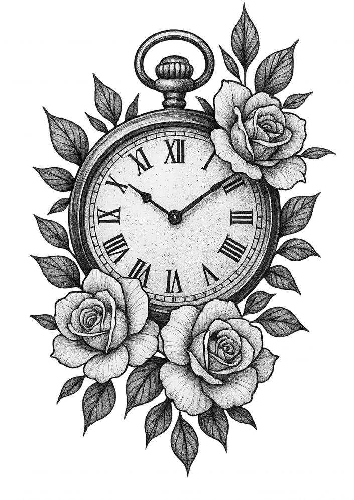 Dekorative Uhr umgeben von stilvollen Rosen in Schwarz-Weiß für ein zeitloses Tattoo.