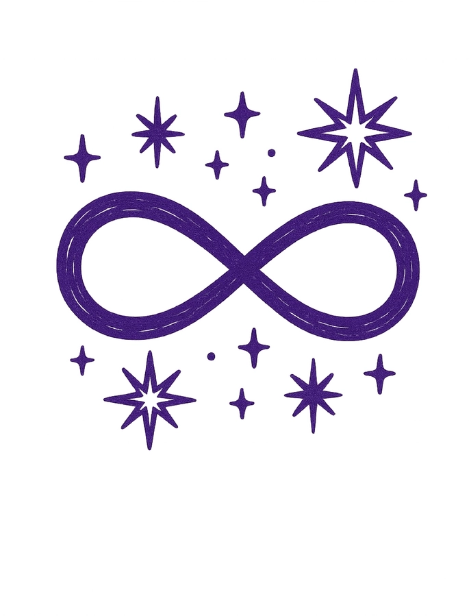 Das Bild zeigt ein unendliches Symbol umgeben von funkelnden Sternen.