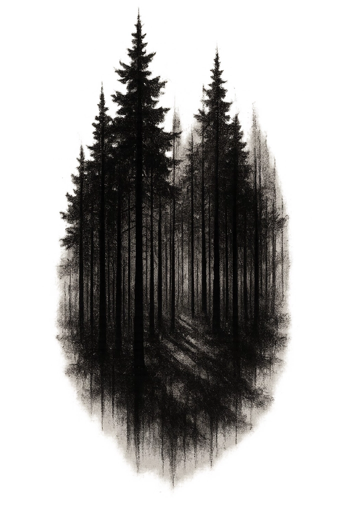 Diese Tattoovorlage zeigt eine eindrucksvolle Darstellung eines Waldes mit hohen Bäumen, die in schattigen Tönen gehalten ist. Die schwarz-weiße Komposition erzeugt eine mystische Atmosphäre und lädt dazu ein, sich in die Tiefe des Waldes hineinzuversetzen. Ideal für alle, die die Schönheit der Natur in Form eines Tattoos festhalten möchten.