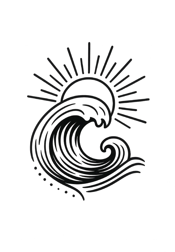 Stilisierte Welle mit Sonnenstrahlen als kraftvolles Tattoo-Motiv.