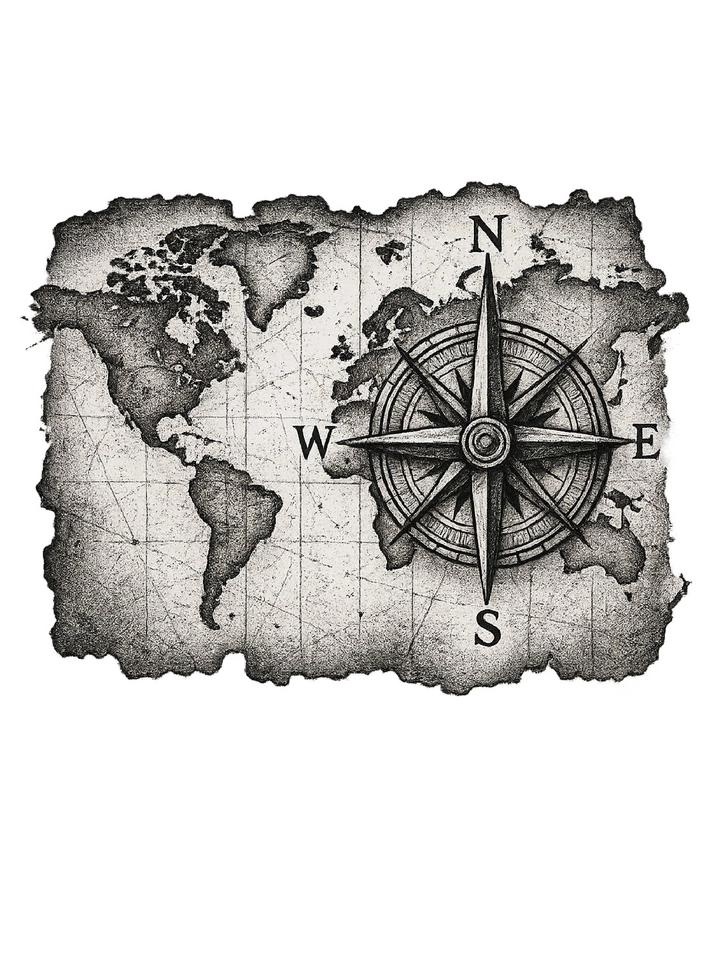 Diese Tattoovorlage zeigt eine detaillierte Weltkarte mit einem Kompass im Vordergrund. Die Karte ist im Vintage-Stil gehalten und vermittelt ein Gefühl von Abenteuer und Entdeckung.