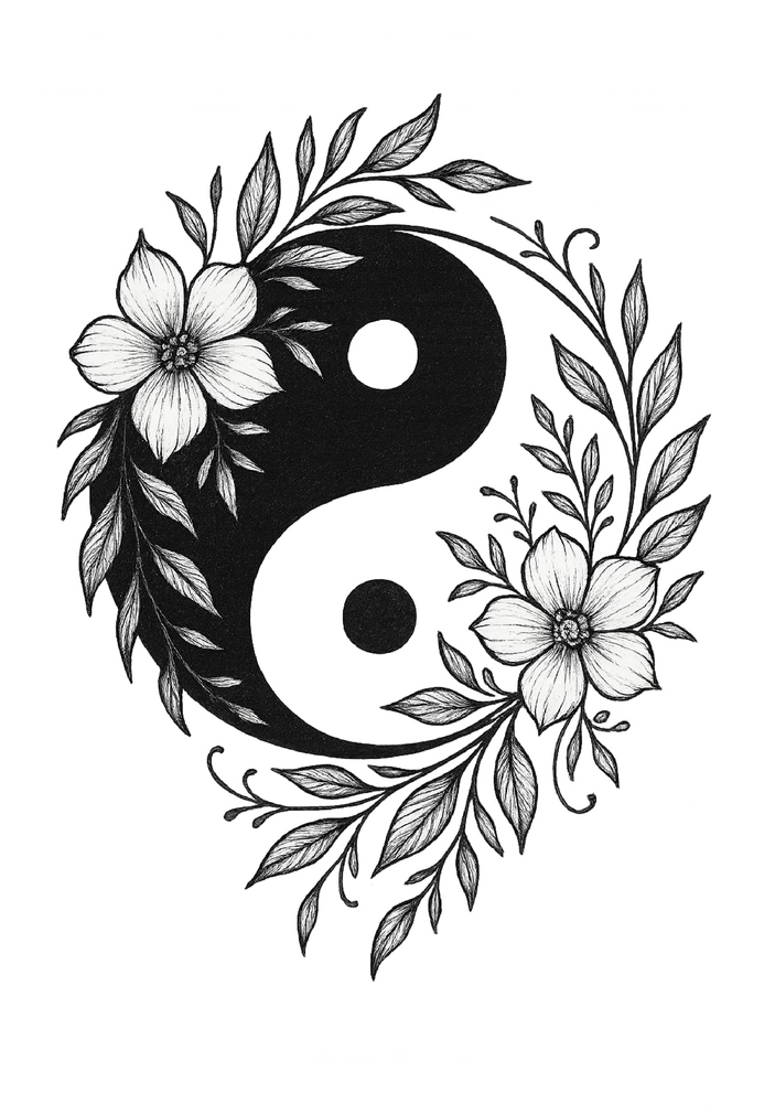 Diese Tattoovorlage zeigt ein harmonisches Yin-Yang-Symbol, umgeben von floralen Details. Die Kombination aus schwarzen und weißen Elementen mit zarten Blumen verleiht dem Tattoo eine einzigartige Ästhetik und symbolisiert Gleichgewicht und Harmonie.