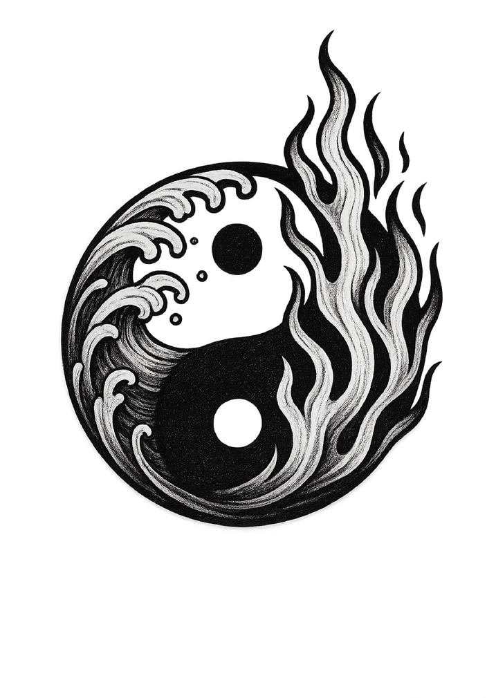Das Tattoo zeigt ein kreatives Yin-Yang-Symbol, das durch dynamische Wellen und Flammen ergänzt wird. Diese Symbiose aus Wasser und Feuer symbolisiert Balance und Harmonie in einem kraftvollen Design.