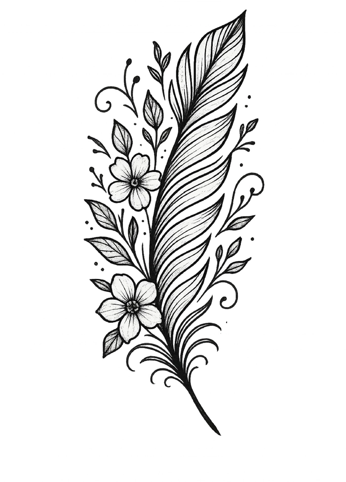 Elegante Tattoovorlage mit Feder und floralen Elementen für einen natürlichen Look.